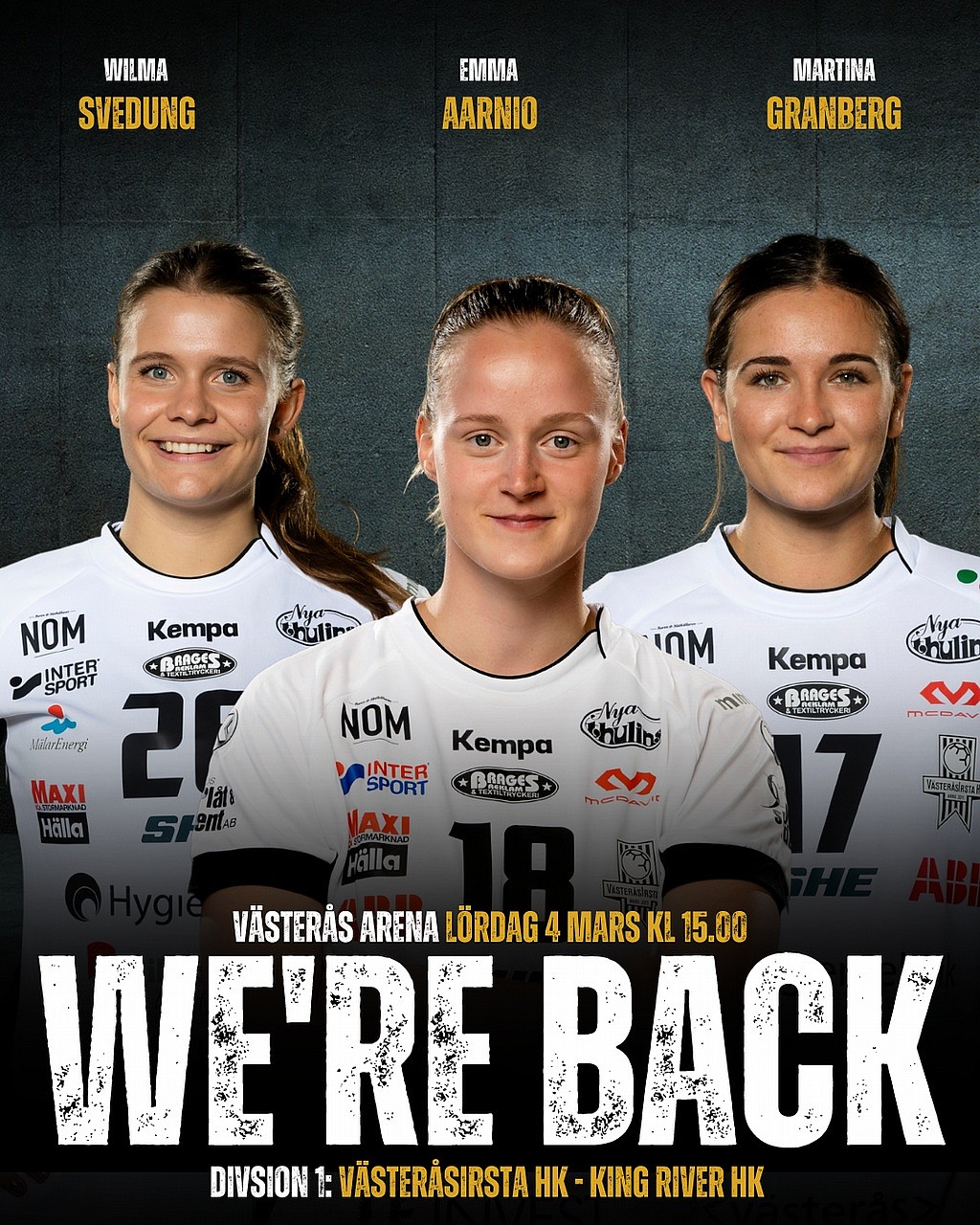Imorgon möter damutveckling King River HK i Västerås Arena. I samband med matchen får laget förstärkning av Emma Aarnio som gör comeback på handbollsplanen efter ett långt skadeuppehåll. Hon får även sällskap av två bekanta ansikten, då Wilma Svedung och Martina Granberg ansluter till truppen. VI träffar Aarnio, Svedung, Granberg och tränare Anders Bergdahl inför matchen och den stundande säsongsavslutningen av Division 1.