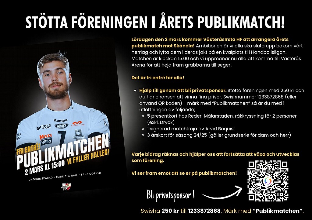 Lördagen den 2 mars kommer VästeråsIrsta HF att arrangera årets publikmatch mot Skånela! Ambitionen är vi alla ska sluta upp bakom vårt herrlag och lyfta dem i deras jakt på en kvalplats till Handbollsligan. Matchen är klockan 15.00 och vi uppmanar nu alla att komma till Västerås Arena för att heja fram grabbarna till seger!