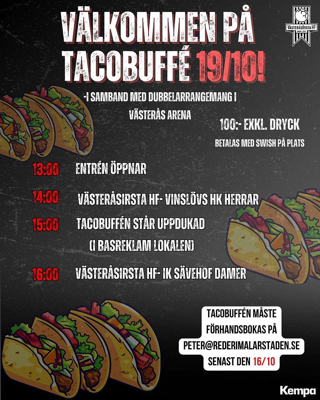 VI hälsar varmt välkommen till Västerås Arena på lördag (19/10) för dubbelarrangemang och tacobuffé!