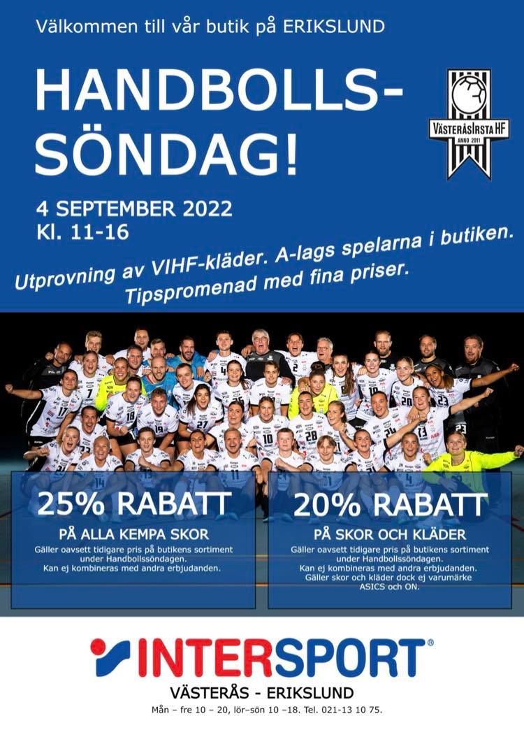På söndag är det handbollssöndag på Intersport. Ett bra tillfälle att prova ut passande skor och storlek på övriga profilkläder. Spelare från A-dam och A-herr finns på plats för att hjälpa till och hitta rätt. Tipspromenad med finfina priser.