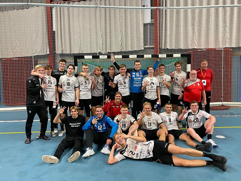 Avslutande kampen mot Bolton var betydelselös för båda lagen. Vi laddade för en fin avslutning men den där riktiga nerven var svår att få till. Det visade sig också i båda lagens försvarsspel, slutresultatet 28-28 beskriver det bra. Lagen följdes åt på resultattavlan och sällan var det mer än två måls ledning. VI var i förarsätet mest hela matchen med 15-13 i paus och som mest 22-19 med kvarten kvar efter ett kontringsmål av Armin Omari. När Albin Sälling och Armin gjorde 27-26 respektive 28-26 med blott 45 sekunder kvar trodde vi det skulle bli en fjärde seger. Tyvärr blev det straff och utvisning vilket gav Bolton chansen med 30 sekunder kvar. Med ett klokt anfallsspel skulle vi ändå kunna stänga matchen. Bolton stressade oss dock till en förtida attack med förlorad boll och time-out som resultat – målvaktens boll med ynka 6 sekunder kvar att spela. Som väntat blev det ett skott lång utifrån som blockades av Albin. Oturligt skruvar sig bollen in lågt i vänstra hörnet. Ett snöpligt slut med tappad poäng men kanske en rättvis poäng för ett bra spelande Bolton. Trots allt slutar vi obesegrade i steg 2!