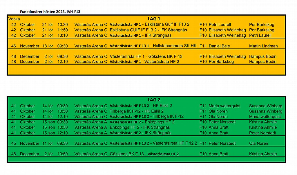 Funktionärsschemat hittar du i bilden och under dokument (Funktionärer) eller här. Vid behov av byten, vänligen kontakta andra funktionärer samt informera Petri.