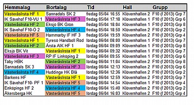 Alla matcher kommer att spelas i Klöverhallen. Vi samlas 40 minuter innan lagets första match. Därefter kommer tränarna informera om när de kommande samlingarna äger rum. (Om inget annat anges är det 40 minuter innan match som gäller.)