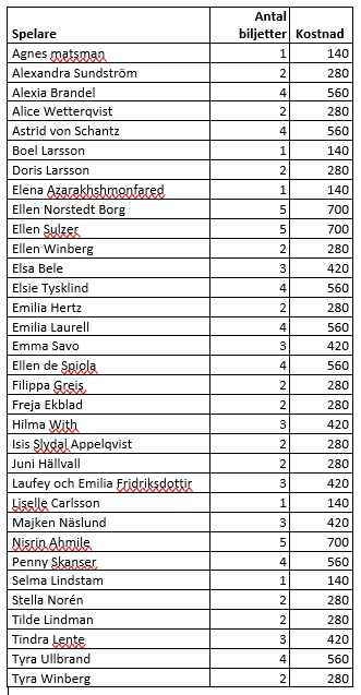 Vi har löst så att alla som har begärt biljetter till landskampen kommer att få en biljett. Se bilden för att ta reda på hur mycket varje tjej ska betala. Betalningen måste göras senast torsdagen den 24 oktober via swish till Veronika på nummer 070-6966087. (märk swishen med ”BILJETT + BARNETS NAMN”)