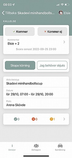 Om ni önskar följa med i bussen skriver ni en kommentar när ni svarar på kallelsen. Tex om ni vill ha två platser utöver ert barn så skriver ni ”Spelarens namn + 2” i kommentarsfältet (se bild) innan ni svarar. Om inget nämns i kommentaren räknar vi bara med att spelaren åker i bussen.