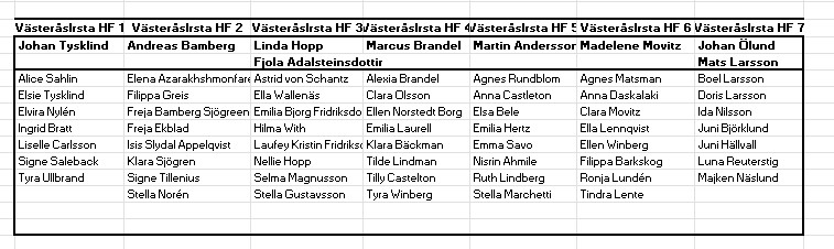 Vi har fått rapporter om att det har varit svårt att se lagindelningen på lag 4 till 7 speciellt om man tittar på en telefon. Nedan kommer lagindelningen igen men i ett annat format, hoppas att det är tydligare.