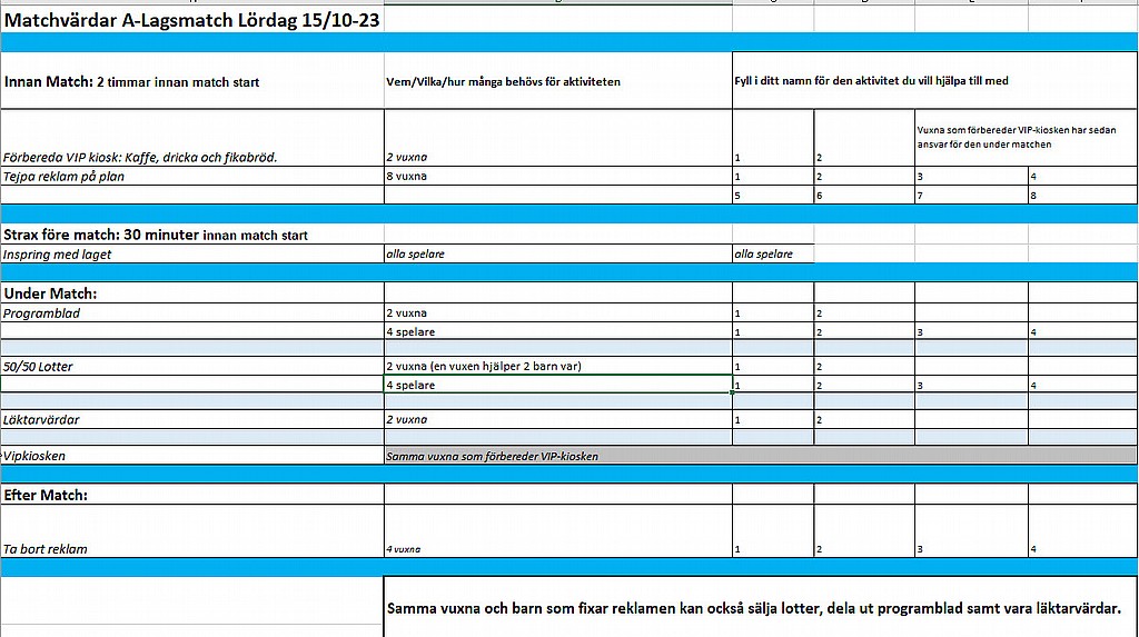 Vi i P13 ska vara matchvärdar för A-laget två gånger under säsongen. Första tillfället är söndag 15 oktober klockan med matchstart 15:00