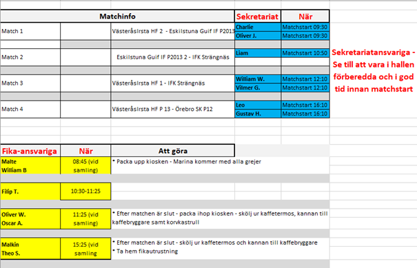 Här kommer uppdaterat schema över ansvariga för kiosk och sekretariat till söndagens matcher i Västerås Arena, hall C.