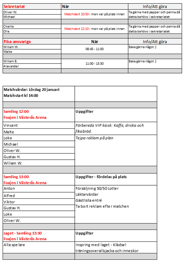 OBS!! på tiderna - På grund av att vi behöver bemanna matchen mellan Enköping och Guif som ligger mellan våra VI-matcher, samt att vårt matchvärdskap för A-laget påbörjas innan vår sista match är spelat, så behöver man kolla extra noga på var och när man ska infinna sig som vuxen.