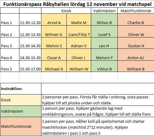 Här i bilden ser ni uppdelningen av funktionärspassen till lördag. Om något händer och ni får förhinder är det eget ansvar att hitta ersättare bland övriga föräldrar.