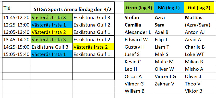 Varje lag samlas senast (!) 30 minuter före första matchen.