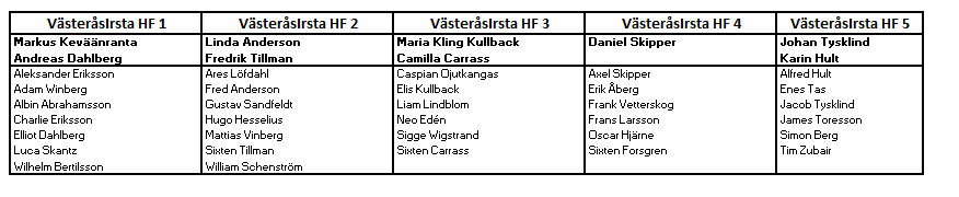 Lagindelningen ser ni i bilden på nyheten. Vi har medvetet gjort många lag för att få mer speltid. Detta kan dock innebära att vi måste flytta spelare mellan lagen och vi ledare kommer kolla med grabbarna om de vill spela extra matcher i andra lag än sitt eget.
