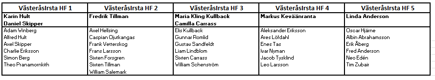 Lagindelningen ser ni i bilden på nyheten. Vi har medvetet gjort många lag för att få mer speltid. Detta kan dock innebära att vi måste flytta spelare mellan lagen och vi ledare kommer kolla med grabbarna om de vill spela extra matcher i andra lag än sitt eget.