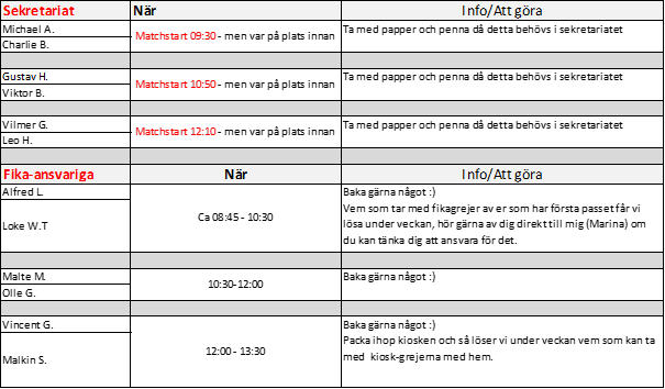 Hoppas det ska funka för alla, annars byter ni direkt med andra föräldrar via tex WhatsApp-gruppen, meddela gärna mig om ni byter så jag kan uppdatera schemat.