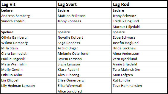 •    Vi ledare har till vår hjälp, Andreas Hedman Larsson (Lilys pappa), Erik Fhürong (Alvas pappa) och Robin Lundholm (Miras pappa) som stöttar upp på tränarbänken under matcherna.