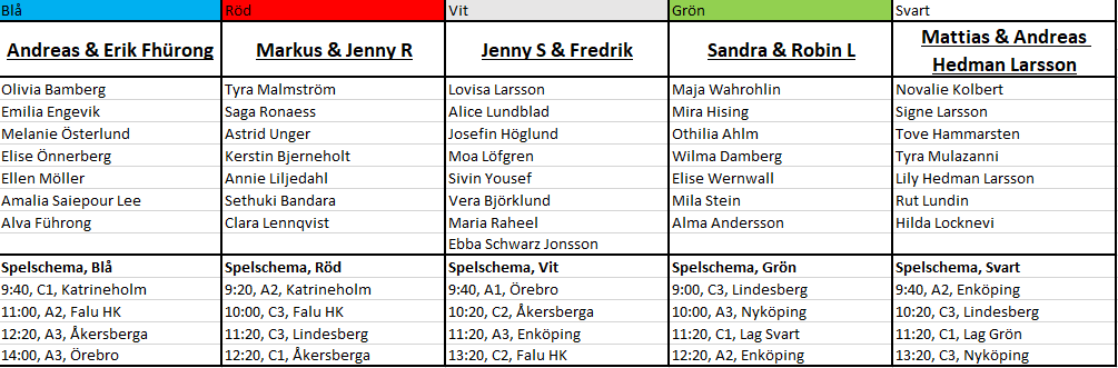 Det kommer vara intensivt och högljutt med 9 matcher som pågår samtidigt, en häftig upplevelse men kan också ta en stund för tjejerna att acklimatisera sig. Som tidigare nämnt så ser vi gärna att alla är med och spelar men vill man absolut inte så meddela oss så vi vet. Vill man inte spela sitter man med på bänken ombytt och hejar och stöttar.